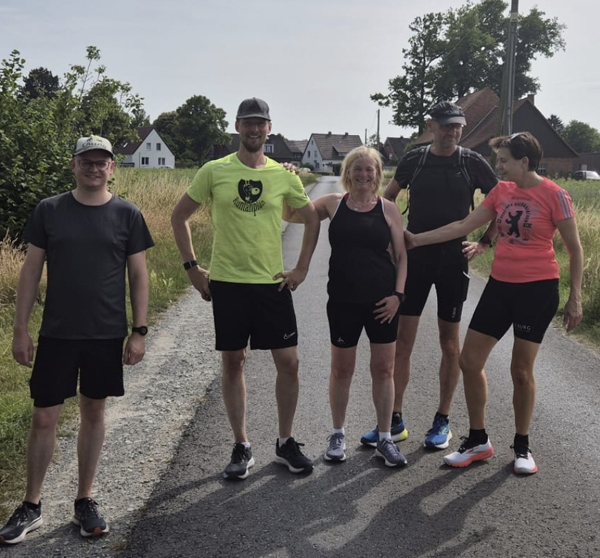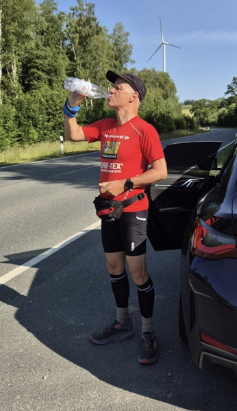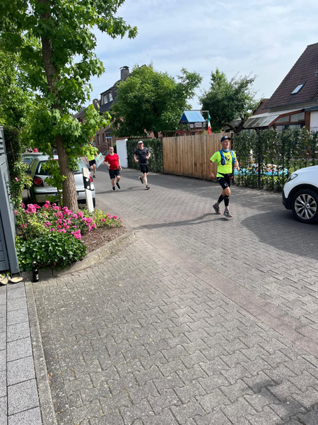 Nachdem ich das Hohenfelde bei Langenberg überquert hatte, kamen meine Schwester Mechthild und Schwager Heinz mit dem Auto auf Höhe von Kfz Reckhaus zu mir. Auch sie hatten kühle Getränke und kalte Tücher dabei. Ich trank erstmal ein halbes Glas alkoholfreies Weizenbier. Kurz danach wurde mir im Stehen schummrig und ich musste mich auf den Acker legen. Mein Schwager Heinz hielt dabei meine Beine hoch. Natürlich waren sie sehr besorgt, aber ich wusste, dass das Vorübergehen würde – und so war es auch. Nach 2-3 Minuten stand ich wieder auf, sortierte mich und ging weiter bis zur nächsten Schattenstelle. Dann verabschiedete ich mich von Mechthild und Heinz und begann langsam wieder zu laufen. Mir war klar, dass sie mich erstmal weiterhin von hinten mit Abstand beobachten würden.