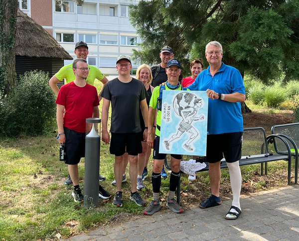 Weiter ging es, mal laufend, mal gehend, über Haus Aussel, an der ehemaligen Bonifatiusschule vorbei, weiter zur Straße am Eusternbach – nur noch 3 Kilometer bis zum Ziel. Plötzlich kam mein Neffe Andreas Klasmeier von hinten angelaufen, und wir waren zu sechst. Die Stimmung war super, und das Tempo war für die anderen kein Problem – höchstens die Hitze machte uns zu schaffen. Dann ging es kurz durch den Stadtholz, und auf der St. Vinzenz Straße kam uns mein ältester Sohn Stefan laufend entgegen. Auch Uli Vollmer war wieder dabei, diesmal aber mit dem Fahrrad. Er hatte mir eine Kappe mitgebracht, auf der stand „Michael 40.000 km geschafft“. Die durfte ich ab jetzt aufsetzen.