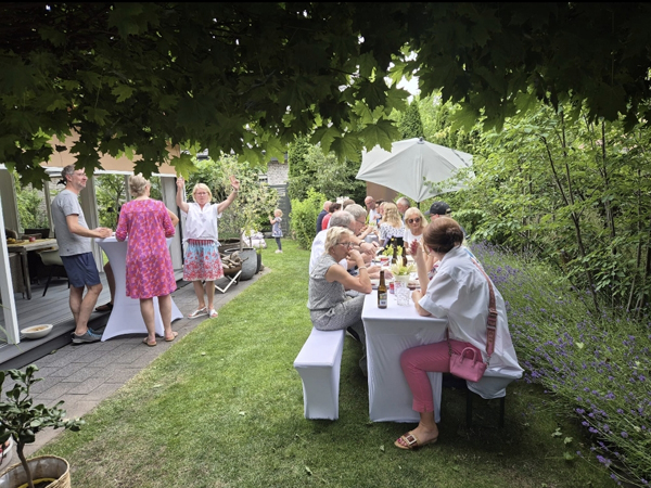Nachdem ich mich kurz gesetzt hatte, konnte ich alle einzeln begrüßen und umarmen – obwohl ich echt nass und verschwitzt war. Gabi hatte mit tatkräftiger Unterstützung ein wunderschönes Gartenfest vorbereitet. Ich war total erschöpft und sah auch ziemlich mitgenommen aus. Als draußen gegrillt und getrunken wurde, legte ich mich erstmal aufs Sofa mit Beinen hoch. Nach dem Duschen habe ich mich gewogen und musste feststellen, dass mir etwa 4 Liter Flüssigkeit fehlten. Das ist ein enormer Verlust und erklärt, warum ich mich so ausgemergelt aussah. Ich trank so viel wie möglich, und im Laufe der Zeit ging es mir deutlich besser – auch wenn ich noch etwas blass war. Essen konnte ich zunächst noch nichts, nur Chips und Erdbeeren – eine etwas seltsame Kombination, aber was soll’s.