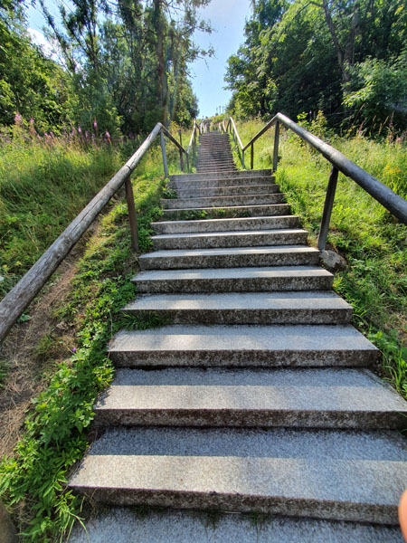 Trotz Navigation finde ich den schmalen Pfad der vom Wanderparkplatz zum eigentlichen Wanderweg führt nicht auf Anhieb. Die ersten 10 Minuten sind damit schon vorbei. Ich weiche von der Route ab und laufe gleich hoch zur Burg Ravensberg. Nach einer anstrengenden Steigung nehme ich mir ein paar Minuten Zeit, um den Ausblick von dort zu genießen und die Schilder zu lesen. Dabei zeigt sich ein großer Vorteil des gemäßigten Tempos. Es ist nicht besonders schwierig wieder in den Tritt zu kommen und nach der Pause den Körper wieder an die Belastung zu gewöhnen. Ich passiere als nächstes den Erlebniswald Cleverschlucht. Auf dem Barenberg bremse ich unwillkürlich ab und genieße ein paar Schritte gehend abermals einen wunderbaren Ausblick. Nach einer Gefällstrecke gelange ich dann in das hübsche Hesseltal, welches durch einige Teiche einen sehr lieblichen Charakter hat. Ein paar Kilometer weiter wartet mit der Großen Egge der höchste Punkt der Strecke. Dort erfahre ich, dass hier bereits vor Jahrhunderten tatsächlich Kohle und Erz abgebaut wurden. Dann erregt ein großer Sendeturm meine Neugierde, dessen Funktion ich nicht einordnen kann. Ich nehme mir etwas Zeit und recherchiere, dass es sich um einen Richtfunkturm der Deutschen Bahn handelt. Was es alles gibt! Von dort gelange ich wieder zurück in das Hesseltal. Just an dieser Stelle scheitert die Navigation. Den angezeigten Weg gibt es nicht (mehr). Alles Probieren hat keinen Erfolg. Die angezeigte Strecke ist ein Irrweg. Frei nach dem Grundsatz, niemals denselben Weg zurück zu laufen nehme ich mir die Freiheit, die Tour noch ein wenig auszudehnen. Gut, dass ich die Burg Ravensberg schon zu Anfang besichtigt habe und nicht erst als krönenden Abschluss. Nach etwa 18 Kilometern und 2:15 Stunden habe ich den Ausgangspunkt wieder erreicht.