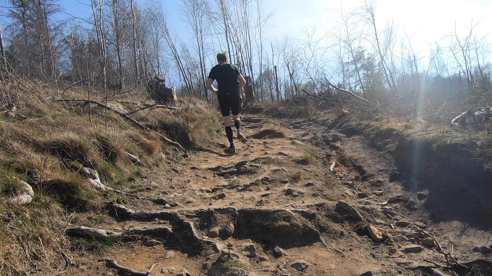 Wer sich dann in Angesicht der am Eggeturm angebrachten Gipfelglocke trotzdem gefragt hat, wo denn der angekündigte „Trail“ bleibt, bekam eine sehr lange und prompte Antwort. Es reicht noch eben für einen Blick auf die alpin anmutende Heidelandschaft des Bergrückens sowie den befreienden Schlag auf die Glocke und schon werden die Läufer neben der ehemals zu militärischen Zwecken erbauten Gipfelstrasse auf einen extrem verwurzelten Streckenabschnitt geschickt.