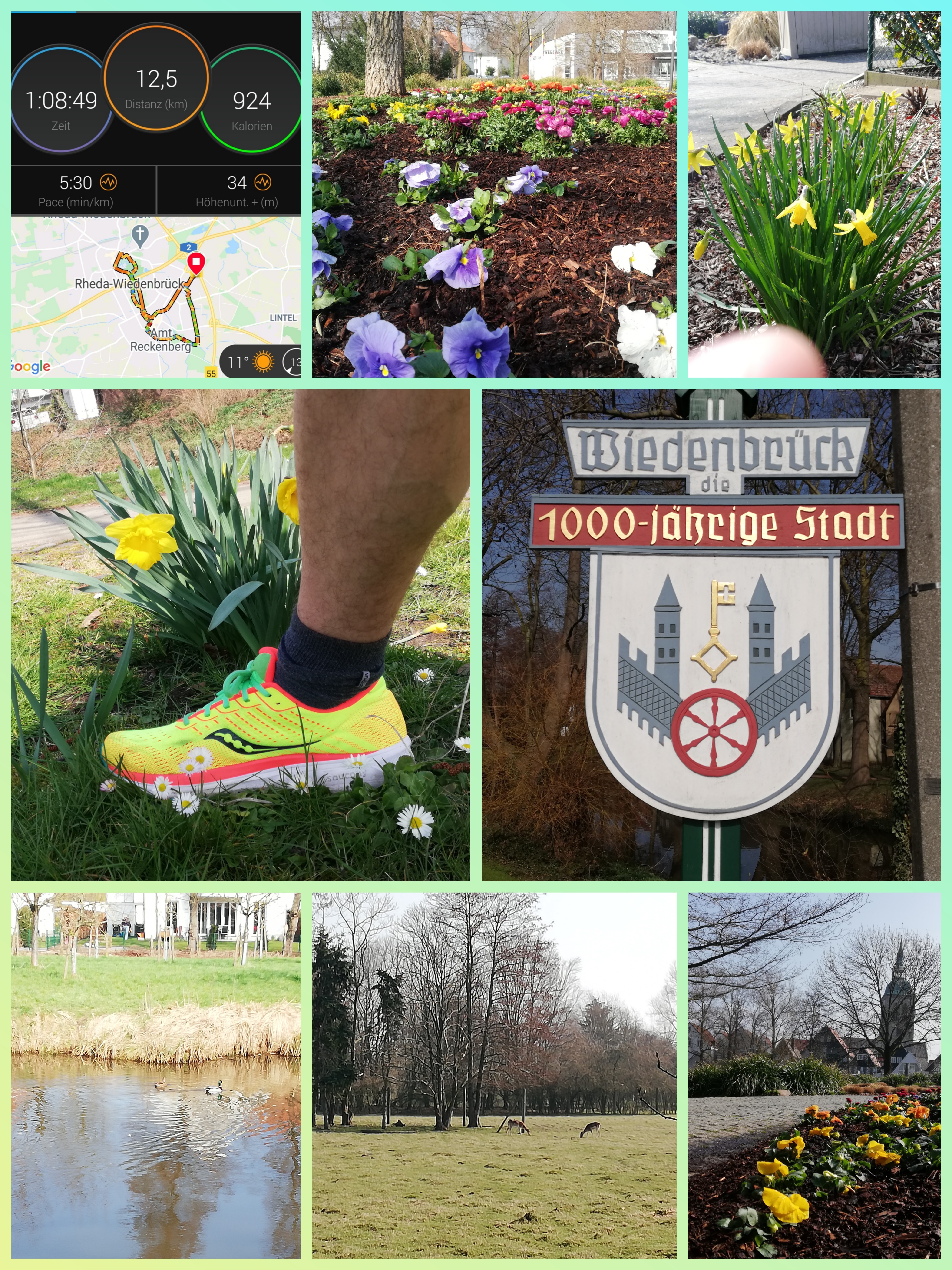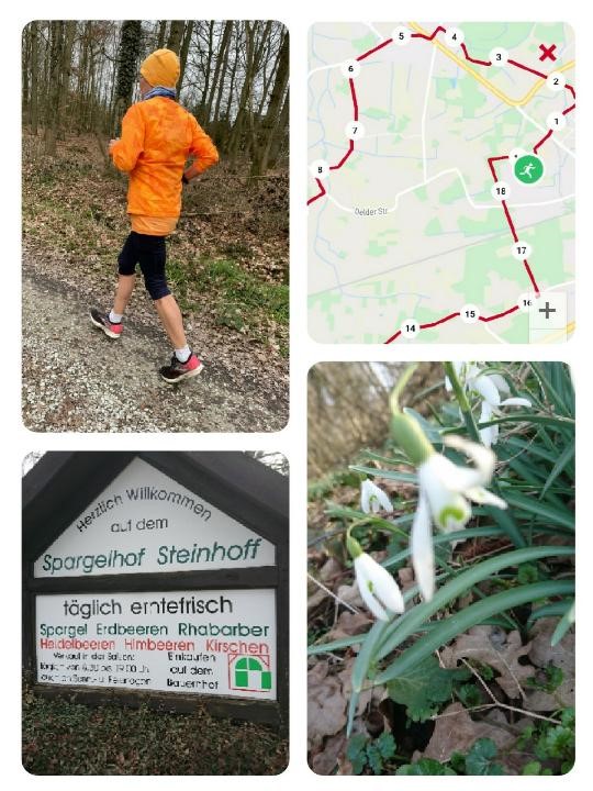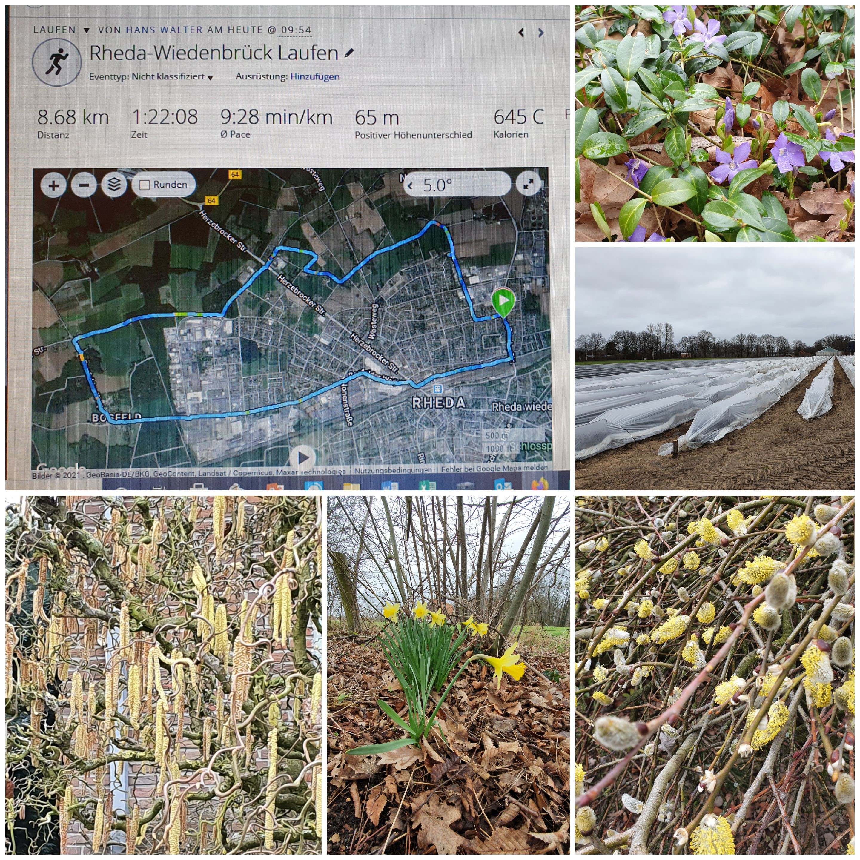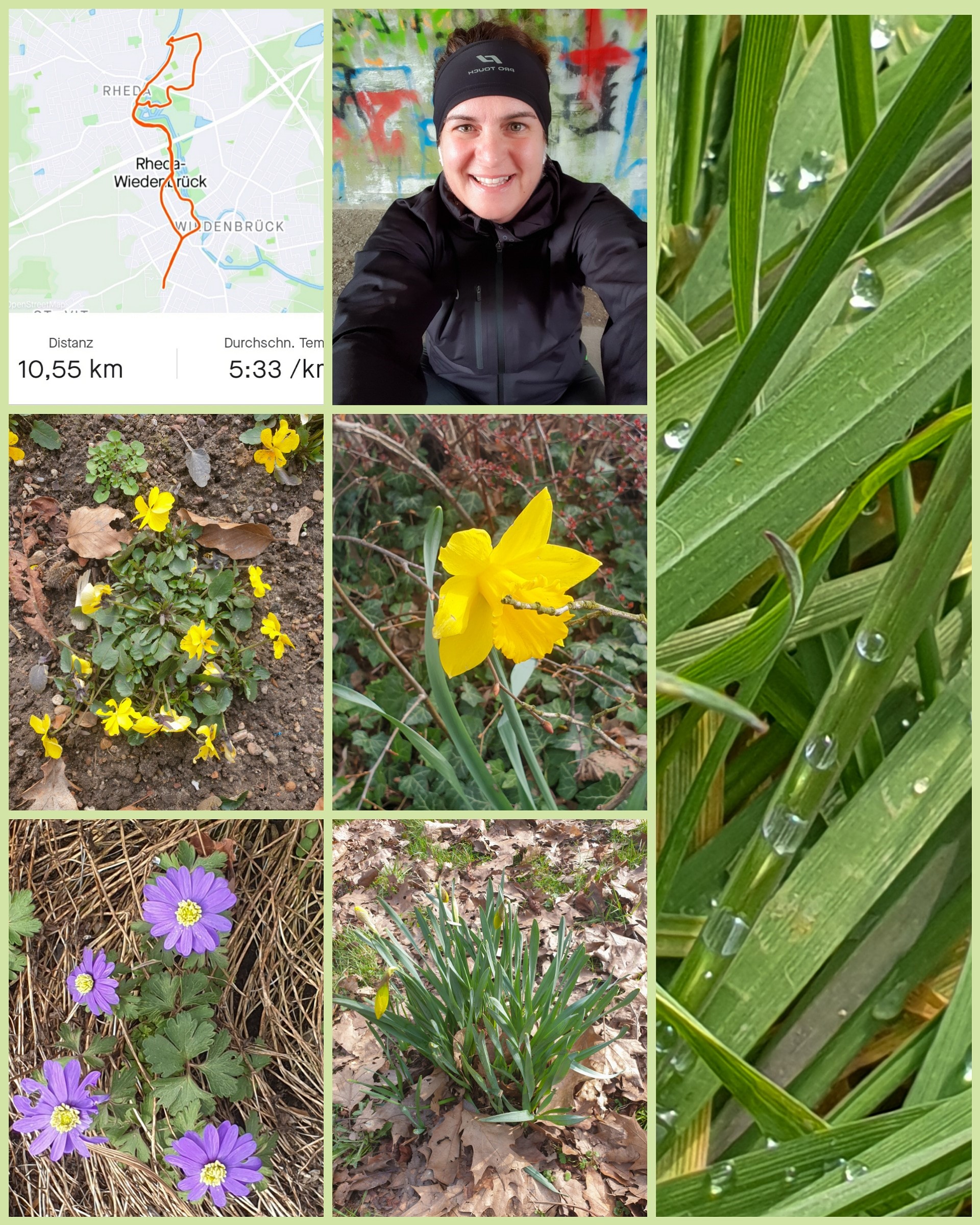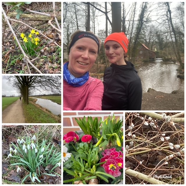 Wir haben uns im Rahmen unseres langen entspannten Sonntagslauf auf die Suche nach dem Frühling begeben. Zugegeben bei dem grauen Nieselregen heute Morgen eine nicht ganz einfache Aufgabe. Aber wir haben es geschafft und hier und da die ersten Frühlingsboten entdeckt. Unsere Strecke führte uns heute von Wiedenbrück nach Rheda, weiter durch den Rhedaer Forst, an der Dalke entlang, weiter in Richtung Kiebitzhof über das Gut Schalück und am Linteler See vorbei zurück nach Wiedenbrück. Eine wirklich schöne Runde. Das war wieder tolle Aufgabe, die echt viel Spaß gemacht hat.