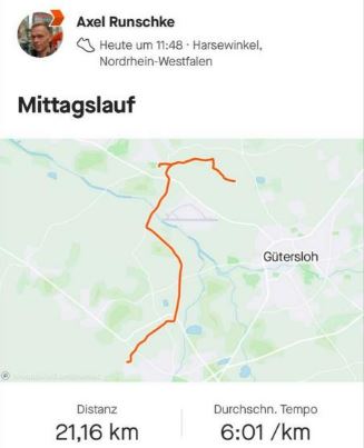 ich habe heute meine Ehrenrunde mit Start in Marienfeld, Richtung Blankenhagen, dann zurück zum Klosterhof, Richtung Pixel nach Rheda absolviert.. Mein grösstes Traum ist dieses Jahr natürlich der London Marathon im Oktober zu dem ich angemeldet bin. Vielleicht findet dieser ja statt... Beim Einzug ins Ziel dürfte dann die Fußballhymne 😀 "You never Walk alone" aus den Lautsprechern dröhnen... Gruß Axel