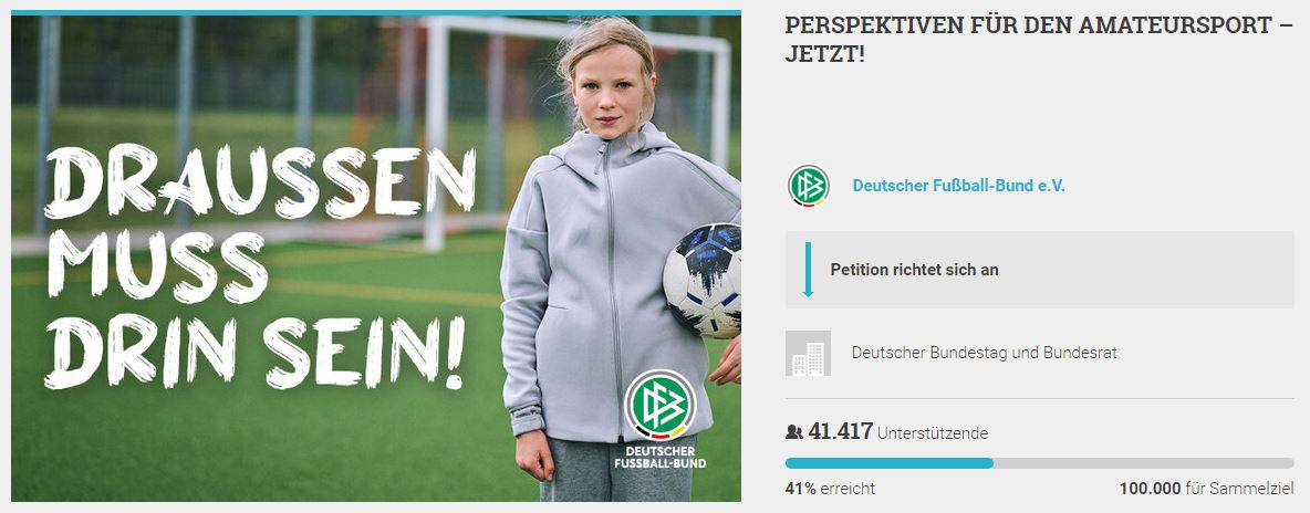 Nicht nur die mehr als sieben Millionen Mitglieder in rund 24.500 Vereinen des DFB sind in den nächsten drei Wochen aufgerufen, die Petition und ihr Vorhaben zu unterstützen. Mit Unterstützung des DOSB sollen auch die Mitglieder, Vereine und Verbände anderer Sportarten sowie alle Sportbegeisterten in Deutschland durch ihre Teilnahme an der einfach auszufüllenden Online-Petition dem Amateur- und Breitensport eine gemeinsame Stimme geben. Unter dem Dach des DOSB sind 90.000 Sportvereine mit insgesamt rund 27 Millionen Mitgliedern organisiert.