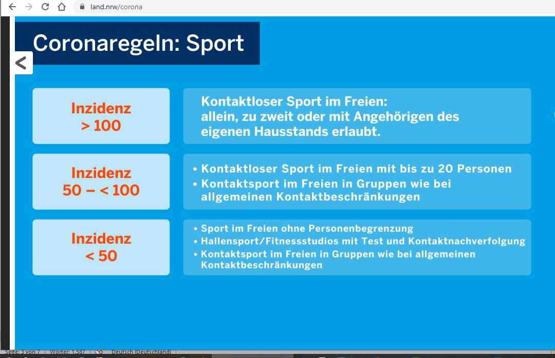 - Hallensport/ Fitnessstudios mit Test und Kontakt nachverfolgung, Kontaktsport innen nur in Gruppen wie bei den allgemeinen Kontaktbeschränkungen