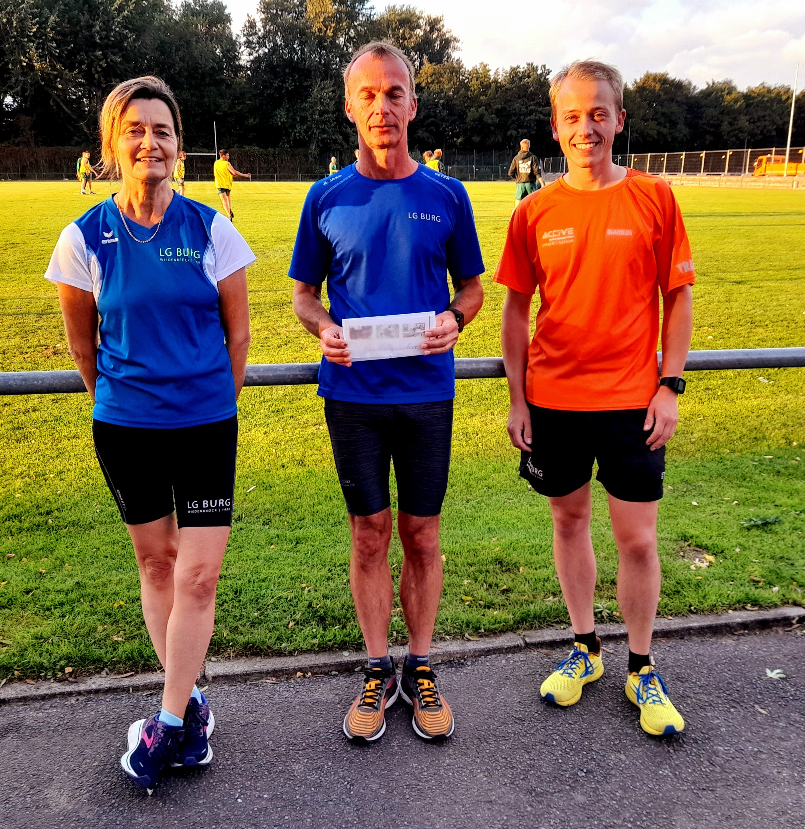 Auf der Jahreshauptversammlung sollte eigentlich auch das LG Burg Mitglied des Jahres 2020 geehrt werden. Am 10.September weilte aber Peter Stienemeier im wohlverdienten Urlaub. Daher holten Berna Masjosthusmann und Markus Elbracht diese Ehrung beim Lauftreff am Donnerstag nun nach und übergaben ein Präsent für besondere Verdienste an den Wiedenbrücker Langstrecken-Läufer.