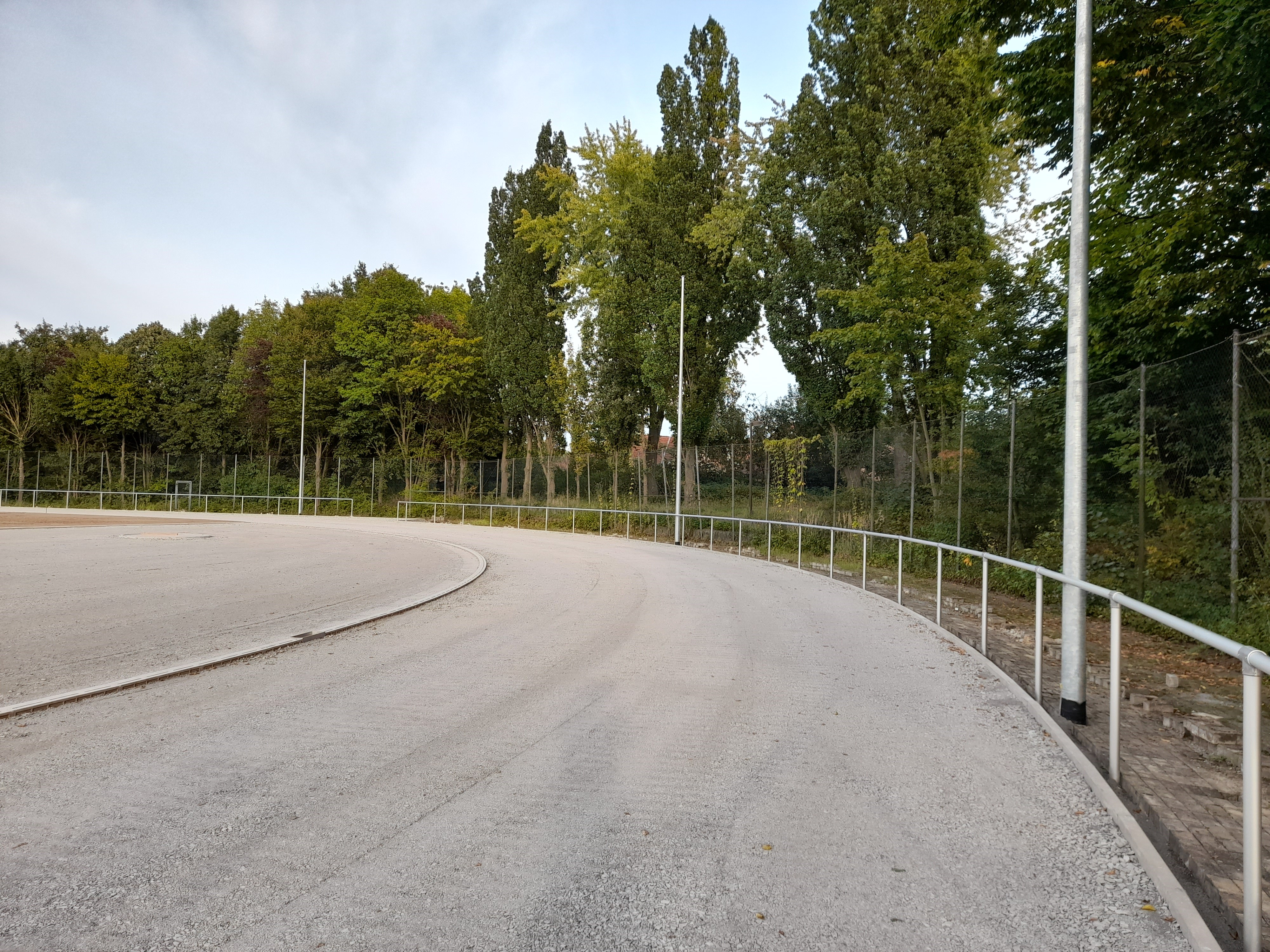 Doch auf der Baustelle geht es voran. Die Laufbahn ist schon wieder zu erkennen und ist asphaltiert, die Masten für die Beleuchtung sind schon aufgestellt!