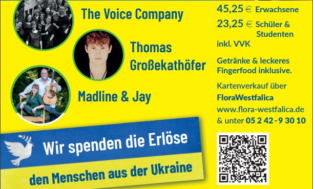 Auch das Benefiz-Konzert in der Stadthalle am Sonntag, dem 03. April 2022 wird dem Bürgerstiftungs-Spendenfonds zugutekommen: mit der Hälfte der Erlöse wird er weiter gefüllt. Die andere Hälfte geht an die Aktion Deutschland hilft als Beitrag für die Organisationen, die direkt in den Kriegsgebieten und in den direkten Zufluchtsländern tätig sind.