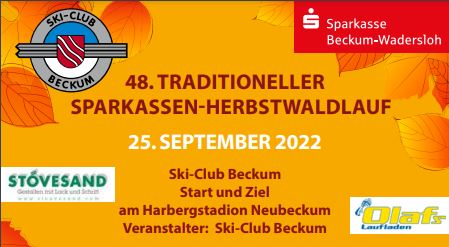 Einladung aus Beckum: Nach der langen Pause veranstalten wir wieder unseren 48.Traditionellen Sparkassen-Herbstwaldlauf. Wir würden uns freuen, wenn viele laufsportbegeisterte Athleten und Hobbysportler an den Start gehen würden. Für gute Stimmung und Verpflegung an der Strecke ist gesorgt.