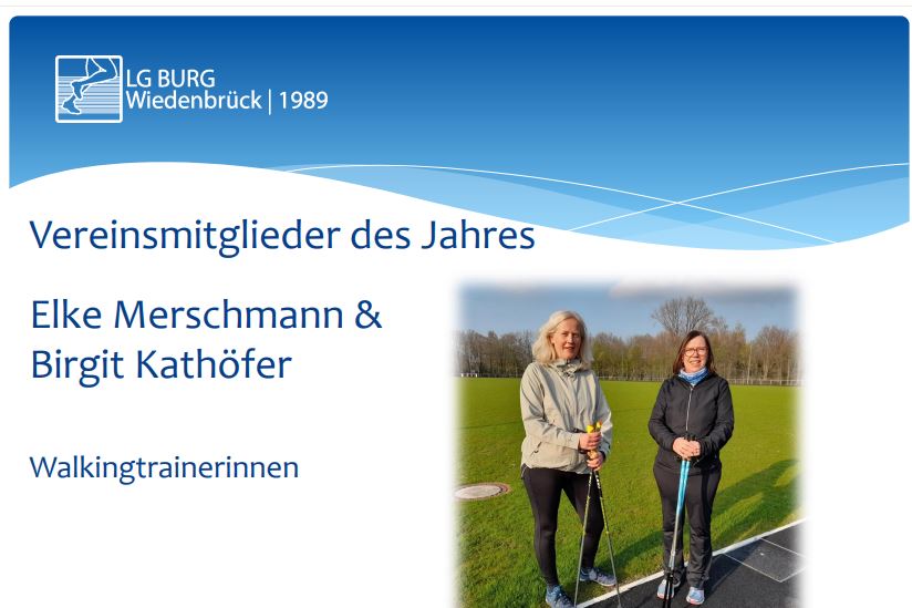 Elke Merschmann und Birgit Kathöfer wurden als Mitglieder des Jahres 2021 ausgezeichnet. Beide haben sich sehr erfolgreich bei der Gründung der Walkingabteilung eingebracht und sind somit Taktgeber für ein neues Trainingsangebot der LG Burg.