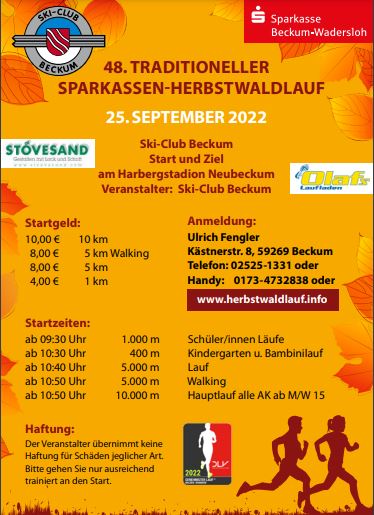 TRADITIONELLER SPARKASSEN-HERBSTWALDLAUF 25. SEPTEMBER 2022 Start und Ziel: Harbergstadion Neubeckum Veranstalter: Ski-Club Beckum