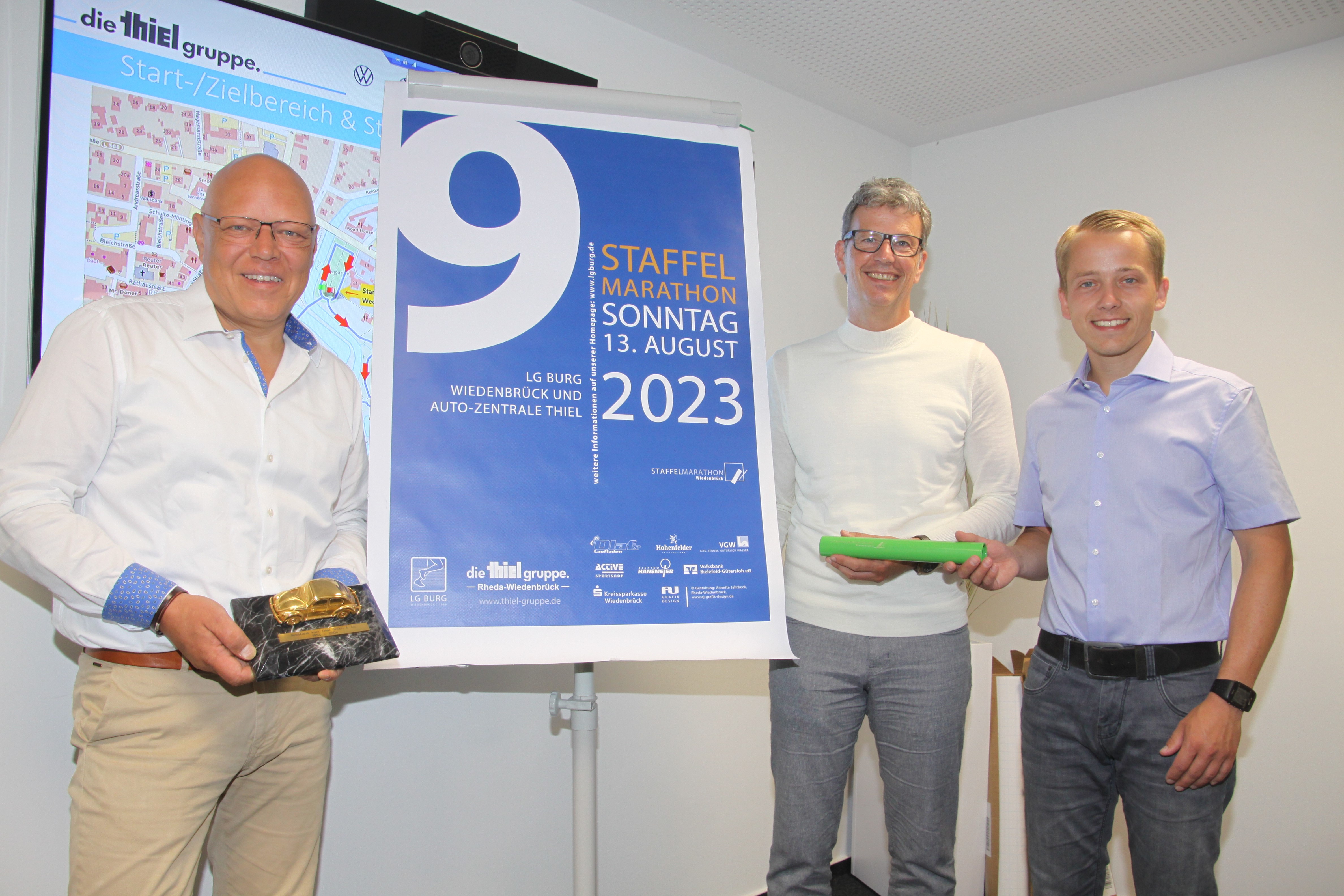 Bei einem Presse-Termin stellten Jürgen Macke ( Thiel-Gruppe) Wolfgang Mainardy (Fürstliche Kanzlei) und Markus Elbracht von der LG Burg die aktuellen Planungen vor. 21 Runden a 2 Km für Staffel-Teams mit jeweis 4 bis max. 7 Teilnehmern. Noch bis zum 30.06 läuft die vergünstigte Anmeldephase für alle Staffel-Helden 2023. Zuletzt trugen sich z.B die Grundschule Pavenstädt, das Simonswerk, Elektro Hansmeier, das “Bootcamp” und gleich vier Staffeln der DJK Gütersloh in die Starterliste ein. Erstmals wird auch ein Sonderpreis für die teilnehmerstärkste Schule vergeben. Alle Infos hier: https://my.raceresult.com/232655/registration