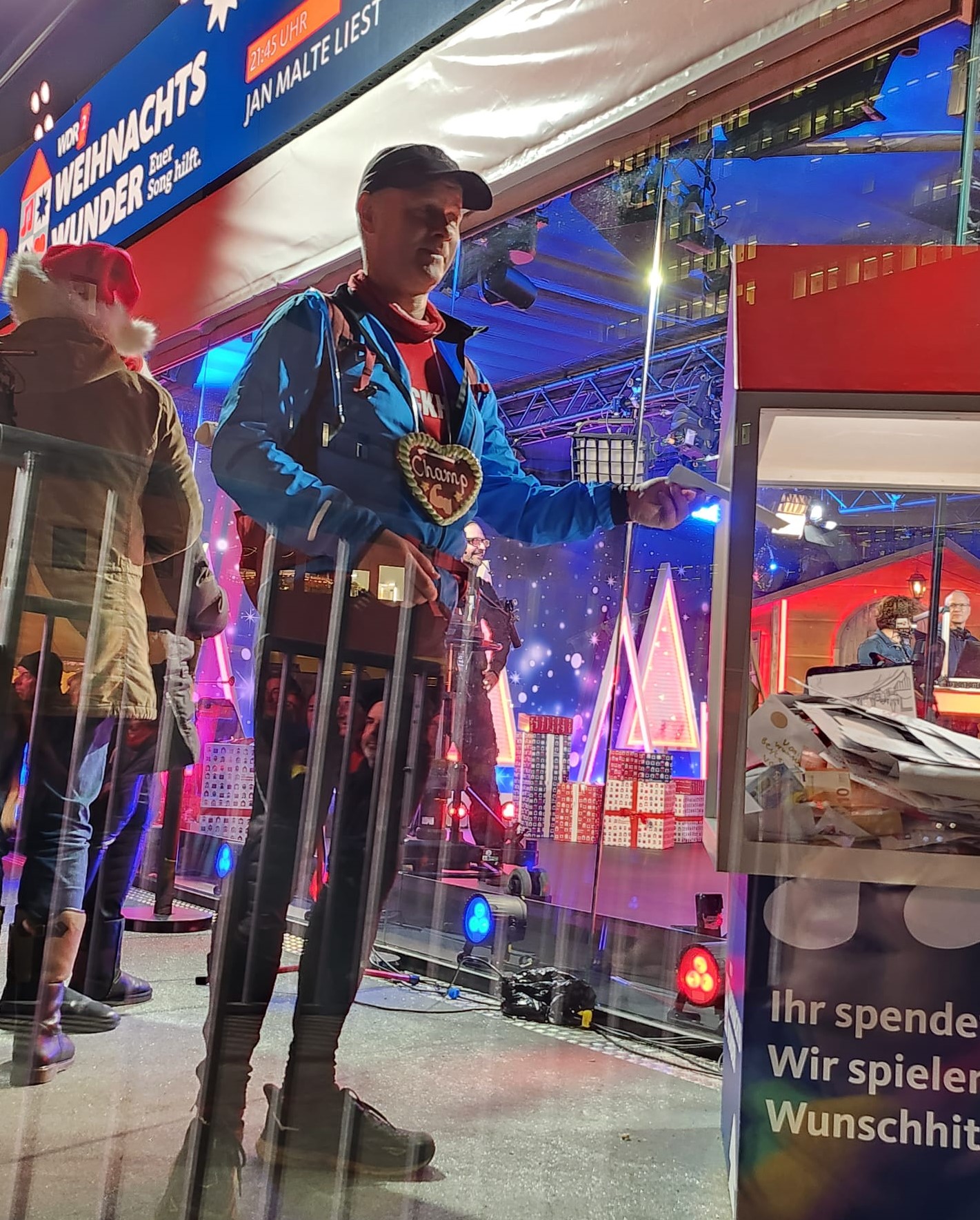Wichtiger war aber der gute Zweck, denn ich konnte 1000€ übergeben. Dann schnell umziehen und erst mal einen Glühwein. Wir waren danach essen in einer nahen Pizzeria. Während des Essens rief WDR2 an und fragte, ob ich noch da wäre für ein Interview in 10 Minuten! Wir haben dann kurz mit dem Kellner gesprochen, haben alles stehen gelassen und sind, ohne zu bezahlen, zur Bühne. Es gab eine kurze Einweisung, wo man stehen sollte aber keine Infos dazu was gefragt wird. Steffi Neu und Sabine Heinrich haben mich dann in lockerer Art interviewt. Zum Schluss hat mir Sabine Heinrich sogar noch einen heißen Tee gemacht und nach draußen gebracht. Wir sind dann wieder zurück ins Restaurant und bekamen unser Essen noch mal aufgewärmt. Alles in allem war es eine gelungene Sache für den guten Zweck.