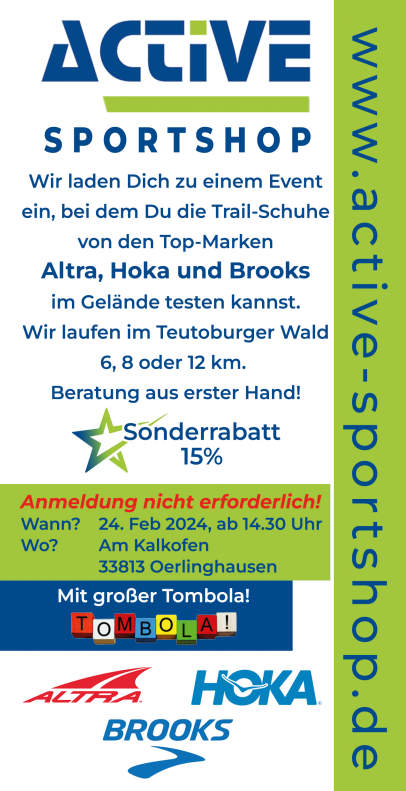 ( IL / LGO ) Ein Termin (nicht) nur für Hermannsläufer:innen: Am 24.02.2024 ab 14:30 Uhr lädt der ACTIVE-Sportshop nach Oerlinghausen ein. Geladen sind alle, die gerne im Gelände laufen. Bei kompetenter Beratung kannst Du Schuhe der Marken Altra, Hoka sowie Brooks im Teutoburger Wald ausprobieren (Teststrecken: 6km, 8km, 12km). Wir freuen uns auf Dich.