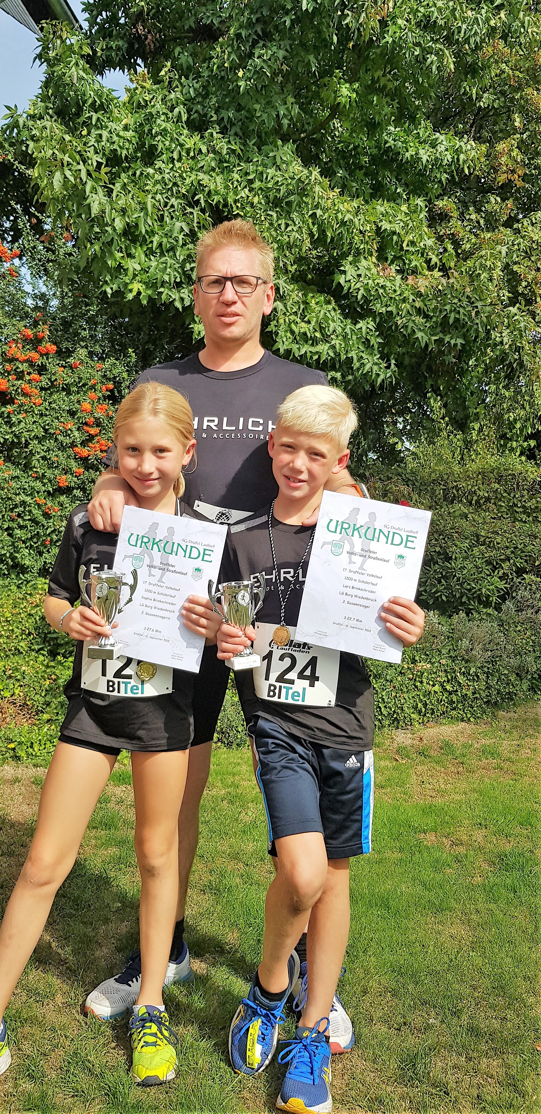 Tolles Wetter und prächtige Stimmung auch im Rietberger Ortsteil. Viele Teilnehmer aus Rheda- Wiedenbrück waren wieder beim Volkslauf in Druffel dabei. Murat Bozduman und Gregor Glomm liefen auf die Plätze 1 und 2. Die Doppelstarter Sophie und Lars ( auf dem Foto mit Vater Matthias) wurden gar mit Pokalen für ihre schnellen Zeiten belohnt.