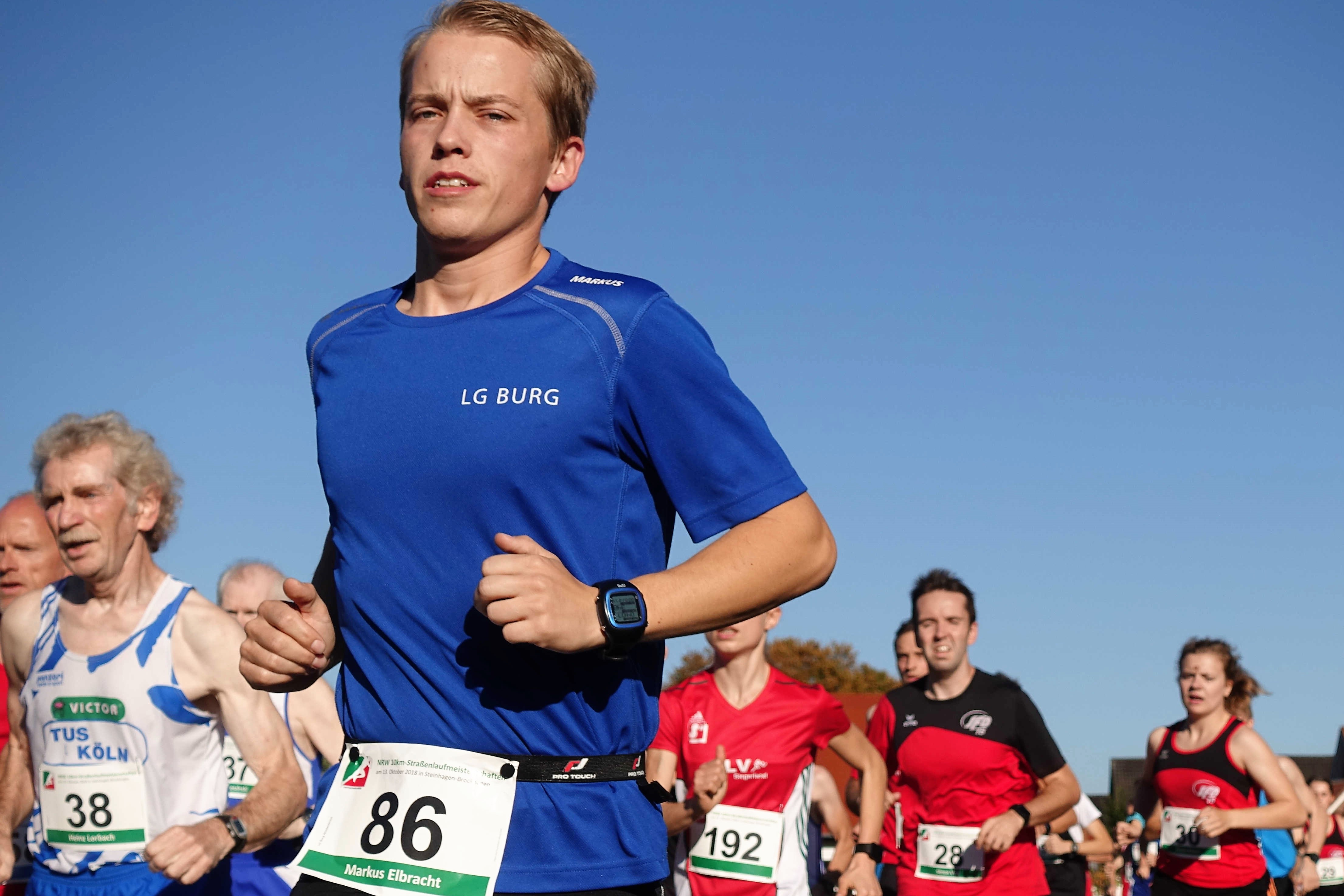Markus Elbracht finishte bei seiner ersten Meisterschaft in 38: 26 Minuten. Hochklassiger Sport mit zwei Streckenrekorden an der Spitze und viel Lob für das kleine Organisationsteam des LAC Steinhagen sorgten für Zufriedenheit. Maximilian Thorwirth (SFD 75 Düsseldorf) konnte bei den NRW-Straßenlaufmeisterschaften in Steinhagen-Brockhagen auf der 10km-Distanz seinen Titel in 31:01 Minuten erfolgreich verteidigen. Bei den Frauen gab es einen Dreifacherfolg für die SG Wenden. Daniela Wurm siegte mit einem komfortablen Vorsprung in 37:04 Minuten vor ihren beiden Teamkolleginnen Christl Dörschel (38:37 Min.) und Judith Hacker 38:47 (Min.).