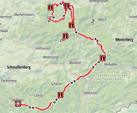 Nach dem Start gibt es eine 14Km Runde um Bödefeld mit den ersten 300 Hm und dann geht es auf die eigentliche Punkt zu Punkt Strecke. Die beginnt mit einem knackigen 300 Hm Anstieg auf die "Hunau" Ab da pendelt man immer zwischen 650 und 840 Hm.Es geht weiter über den Kahlen Asten und ab dort folgt man dem Rothaarsteig über Lenneplätze, Kühude und weiter bis Jagdhaus.